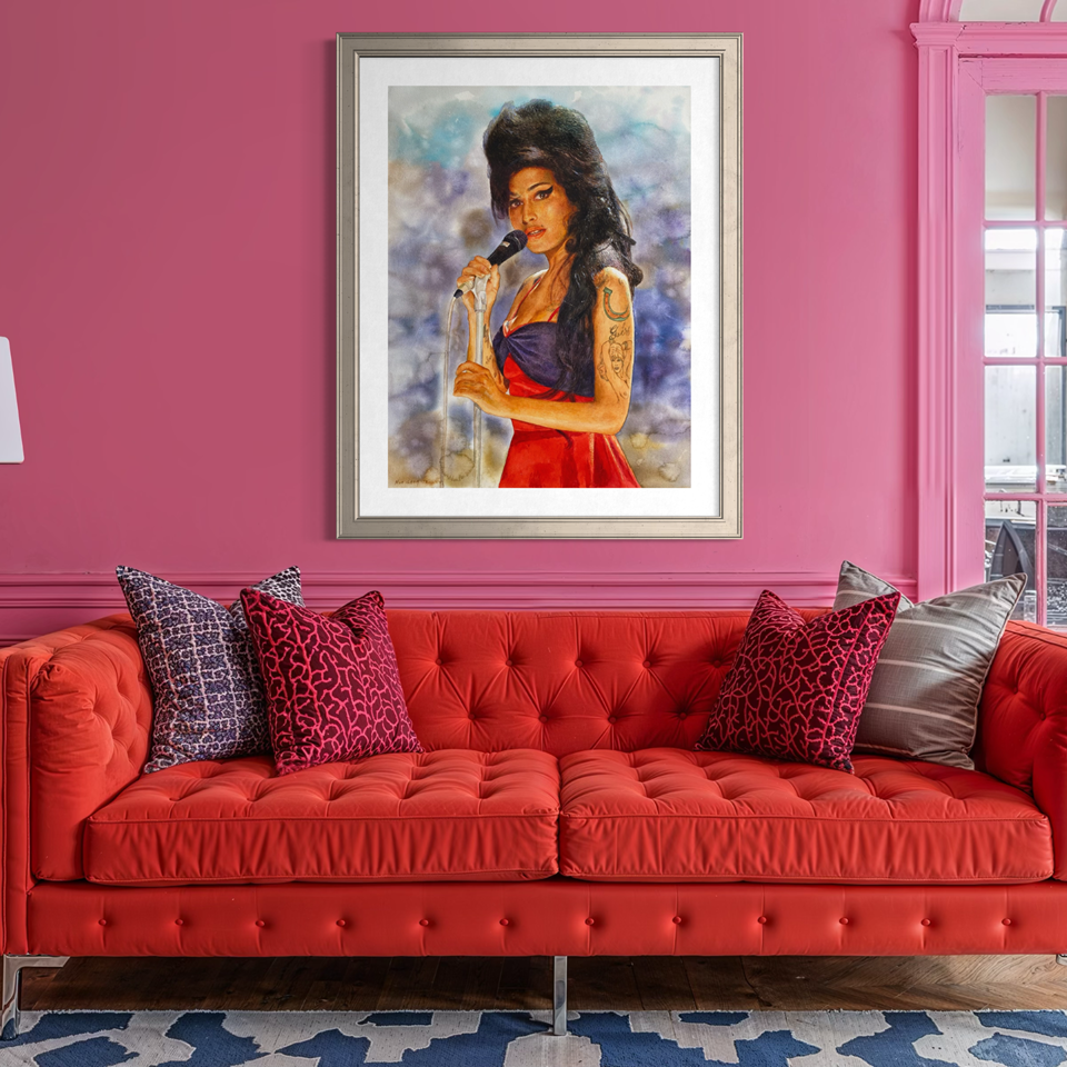 This statement piece large scale 1/1 original watercolour capturing Amy Winehouse at the 2007 Brit Awards. A triumph of texture, shadow and fine detail. It is pared with a matching Bond in the same frame and mount board. This will never be reproduced or printed.