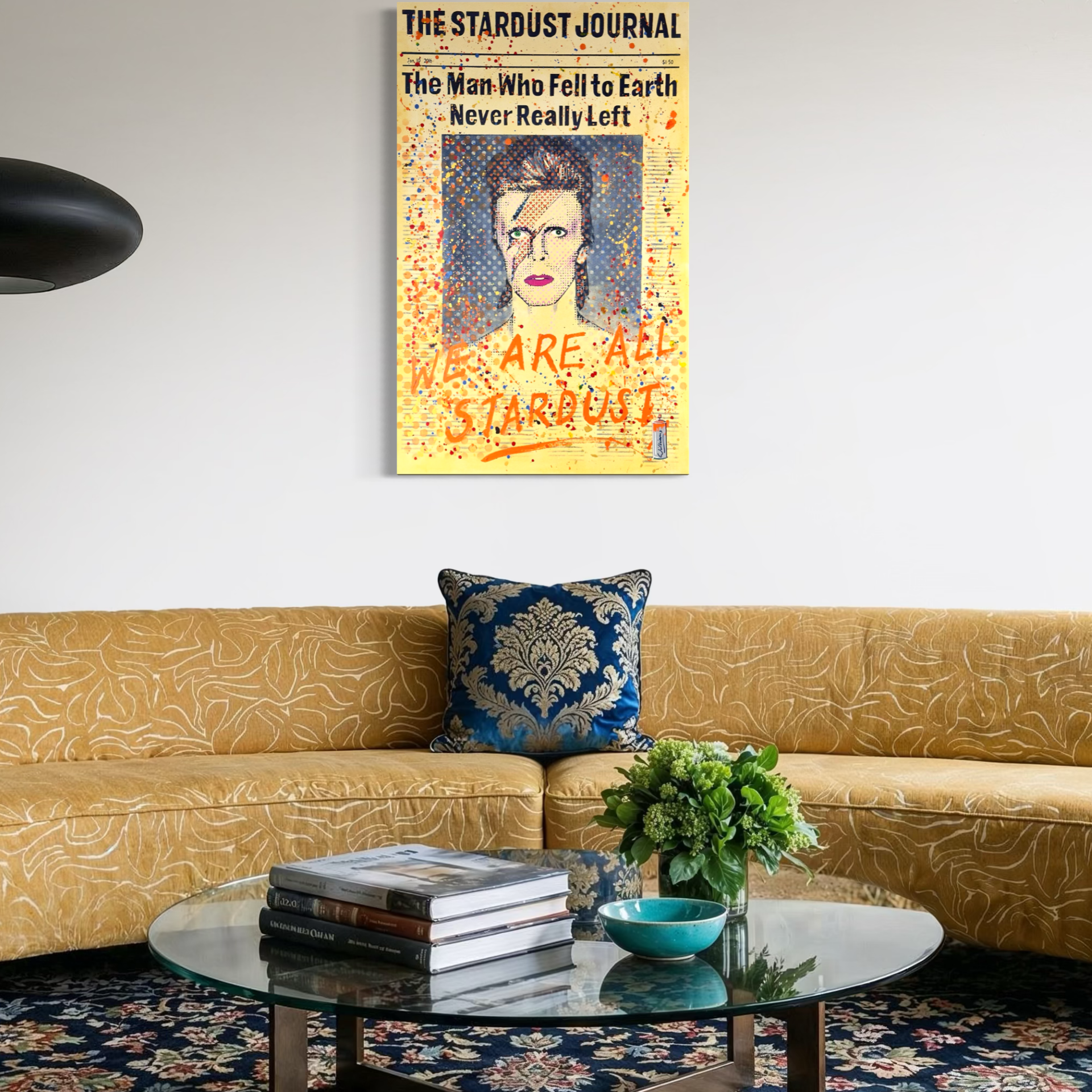 'We Are All Stardust' is a tribute to David Bowie, and the alter ego that redefined identity in popular culture, Ziggy Stardust. Set against a backdrop of distressed print and fragmented headlines, the piece captures Bowie at his most transformative, otherworldly, theatrical, and impossible to confine. The visual language reflects constant reinvention, where image, sound, and self dissolve into something fluid. The bold, defacing statement cuts through the composition, shifting the narrative from performance to something more universal.